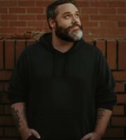 A grayscale photograph of a person from behind wearing a cap with the words 'HUMAN MADE' on it. The individual has their arm raised, possibly in a fist. The background is blurred with various lights and an indistinct cityscape visible.